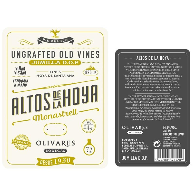 Assemblage de 95% de Monastrell et 5% de Garnacha. Les vignes sont non-greffées et ont une moyenne d'age de 55 ans. Toute la vendange est manuelle et le vin est élevé pendant 6 à 8 mois en chêne français, une combinaison de fûts et de cuves de 60 hectolitres. Seul un petit...